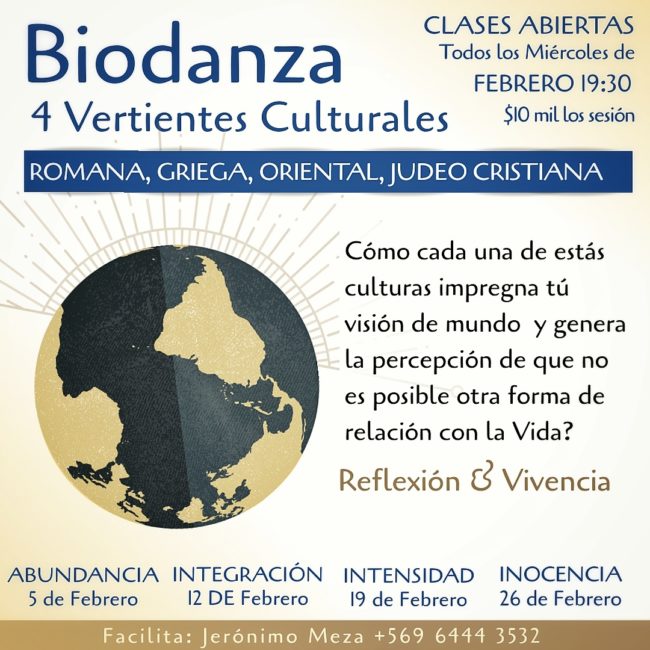 4 Vertientes Culturales CICLO ABIERTO DE BIODANZA EN FEBRERO Las 4 Vertientes Culturales son un acceso reflexivo, propuesto por Rolando Toro (creador de Biodanza) para indagar sobre la causas que generan la sensación de que el modelo cultural actual no se puede cambiar. La propuesta de ciclo abierto consta de cuatro sesiones una para cada…